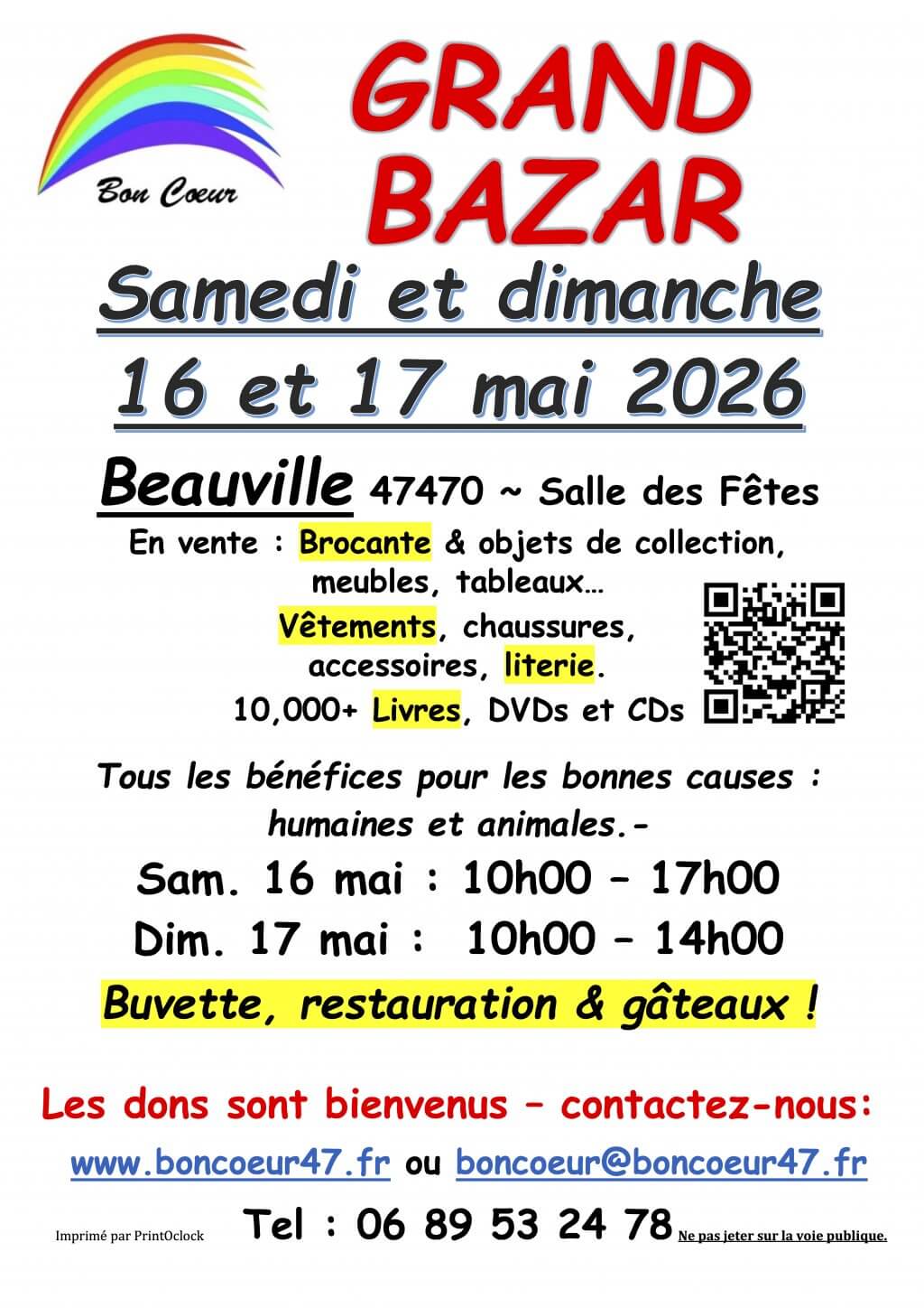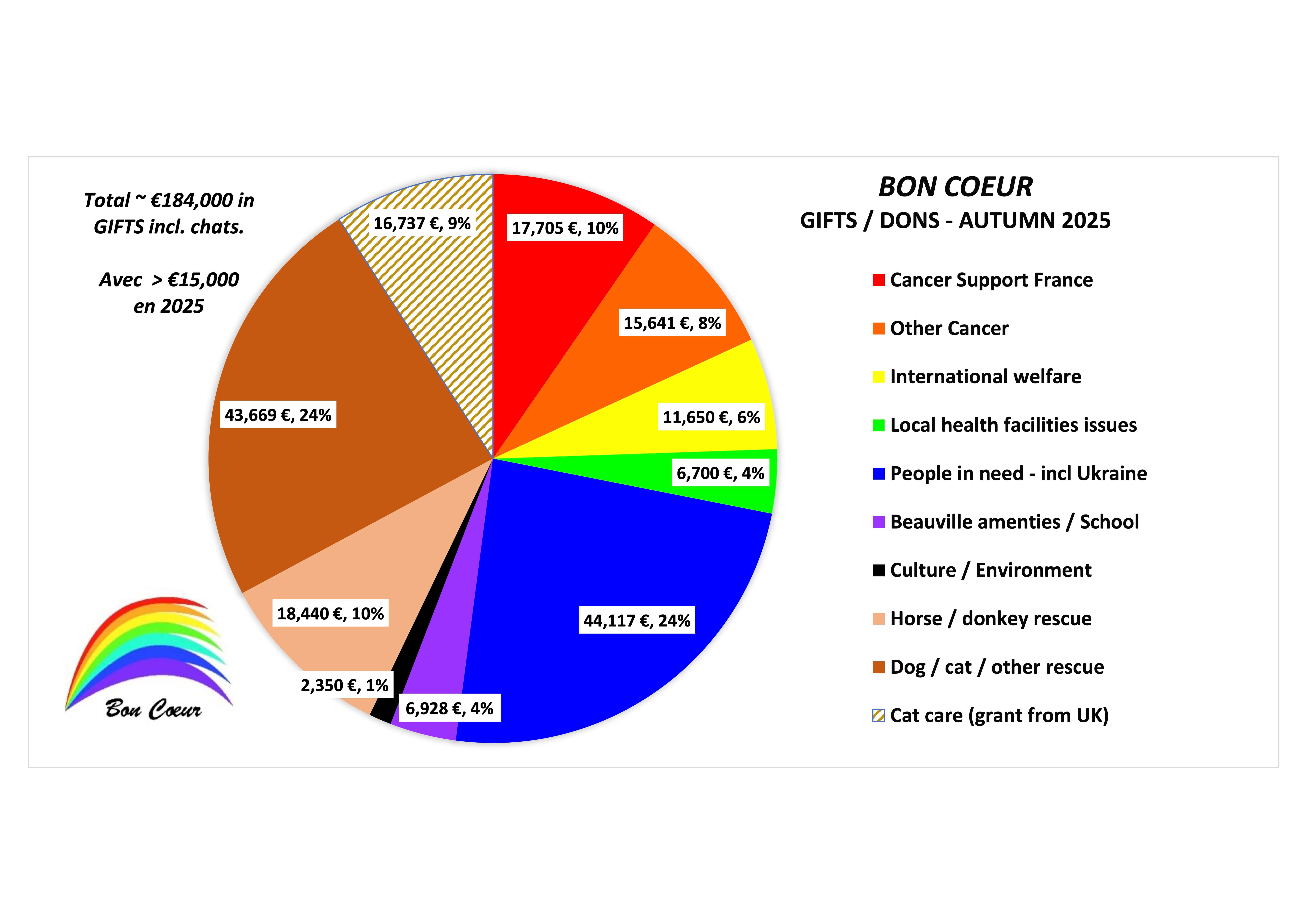 Bon Coeur is a not-for-profit Association under French law that raises funds for deserving organisations providing services to humans or animals. The funds come from donations, purchases at our boutique in Beauville and from events in and around the Beauville area. Over the ten years to the autumn of 2025 we distributed over 180 000€ to good causes.